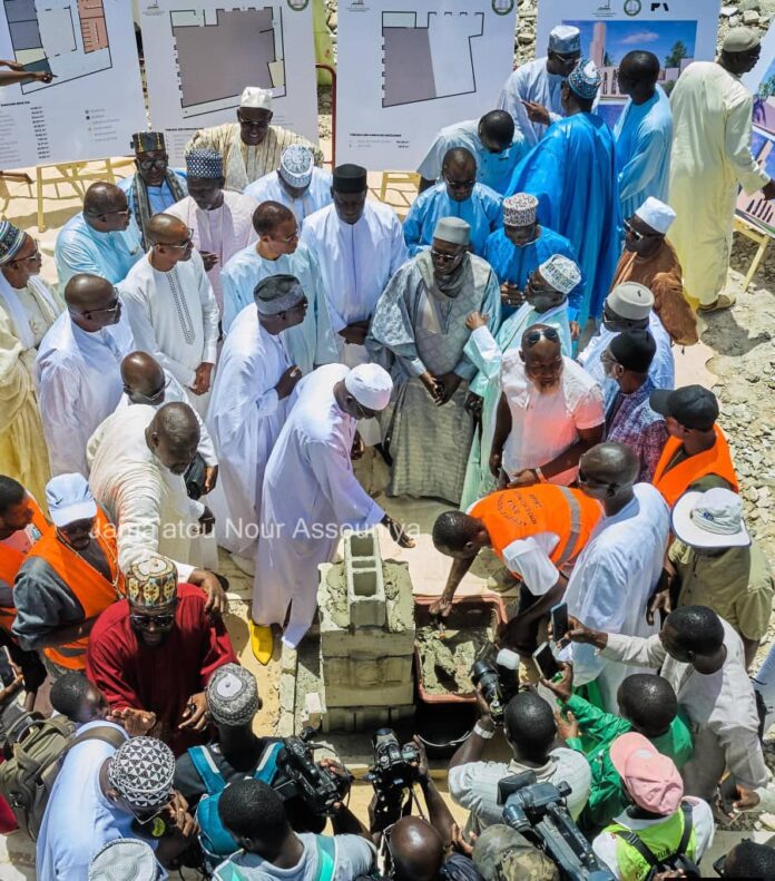 En compagnie des différentes autorités présentes à la cérémonie, Sérigne Cheikh Ahmed Tidiane Sy Dabakh a procédé à la pose officielle et symbolique de la première pierre avant le démarrage des travaux.